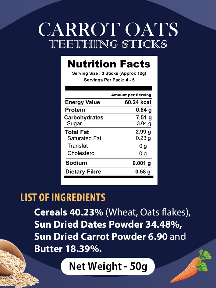 - Carrot Oats Teething Sticks – Carrots and dates add a natural sweetness and flavor to the teething sticks.