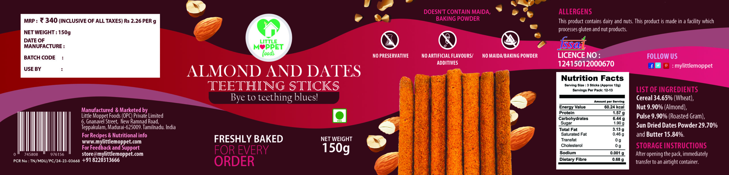 My daughter is 1.5 year old .she is very lazy when it comes to eating. but she really Loves this almond dates teething sticks.amd also it is very useful while travelling.she need some snacks .so this one is best we can blindly give it to her.bcoz it is nutrients rich and no preservatives in it.thank you my little moppet for ur delicious food items for my little one.