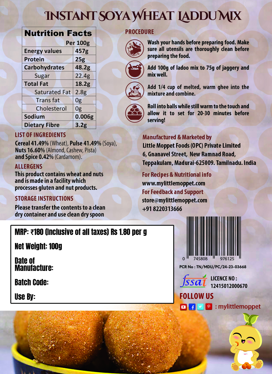 - The mix helps make protein-rich laddoos, since it contains whole grain flours like wheat and soy flour.