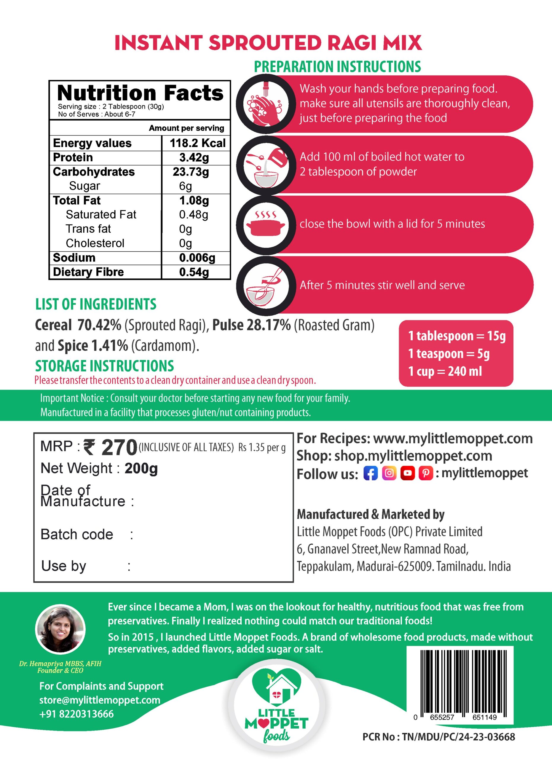 - Little Moppet Food’s Instant Sprouted Ragi Mix is a nutritious meal for your baby and convenient for you to prepare